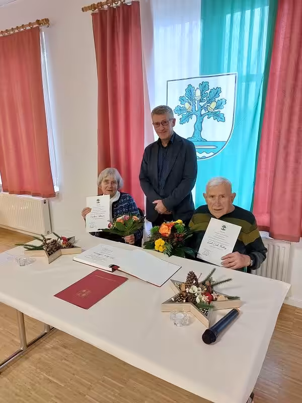 Bevor es dann an Kaffee und Kuchen ging, gab es eine festliche Premiere: Barbara Uhlmann (89) und Karl Freitag (85) wurden auf Beschluss der Gemeindevertretung als erste Einwohner in das Ehrenbuch eingetragen, sind jetzt also Ehrenbürger von Dalberg-Wendelstorf. Der Vorsitzende des Sozialausschusses und langjährige Bürgermeister der Gemeinde, Helmut Haberer, würdigte in seiner Laudatio das langjährige, herausragende bürgerliche Engagement der beiden für ihr Heimatdorf.